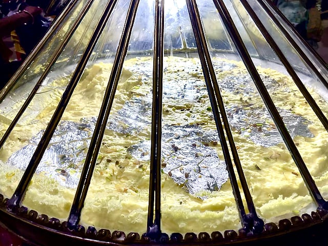 The cloudy makhan malai is made by an elaborate process that requires tenderness and patience. A rhythmic momentum is created by hands pulling across a primitive blender to churn out the makhan from the malai. This process turns milk into fresh, handmade butter. To add extra flavour, sugar, cardamom powder and yellow food color are sprinkled over the portion.