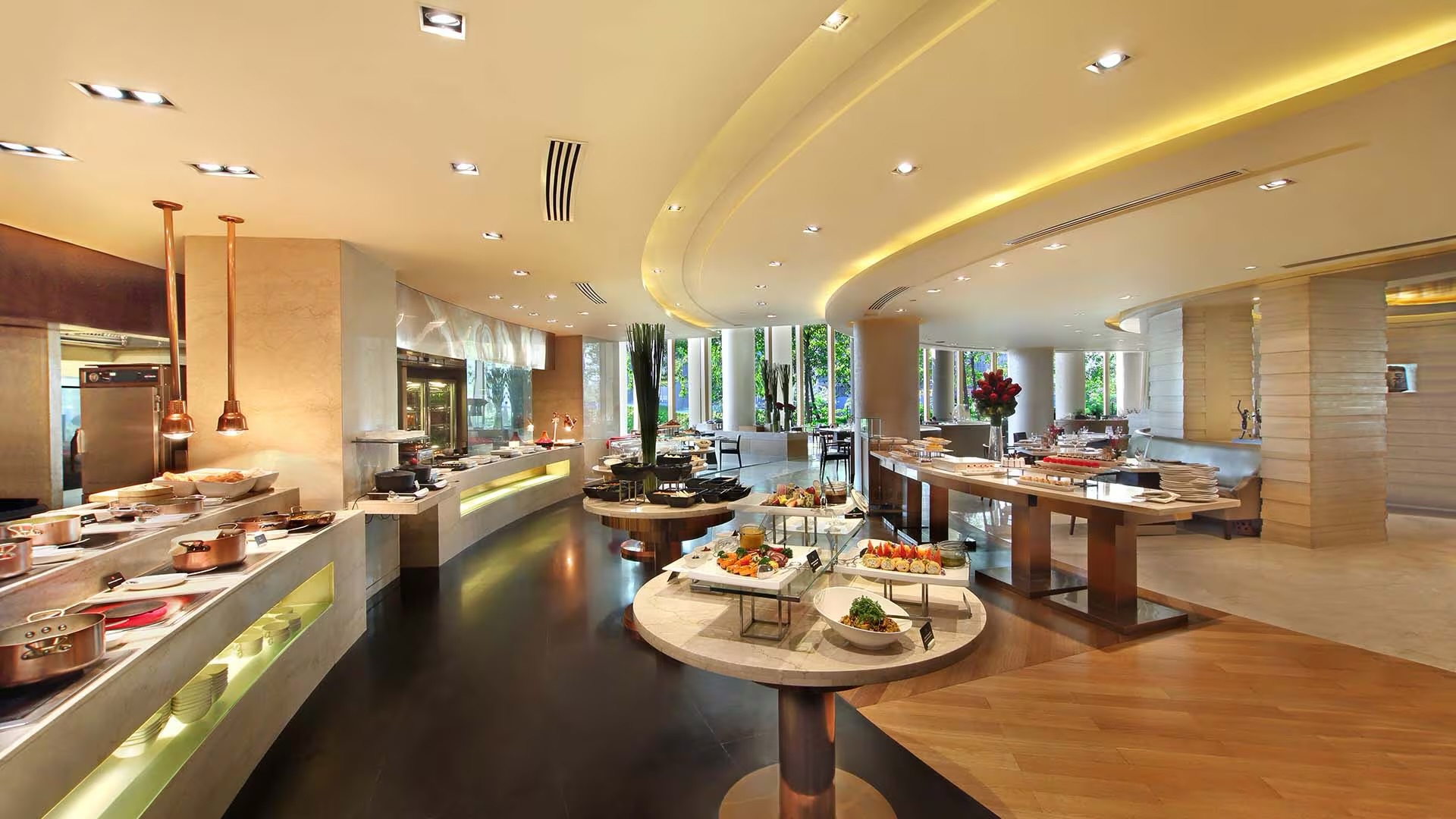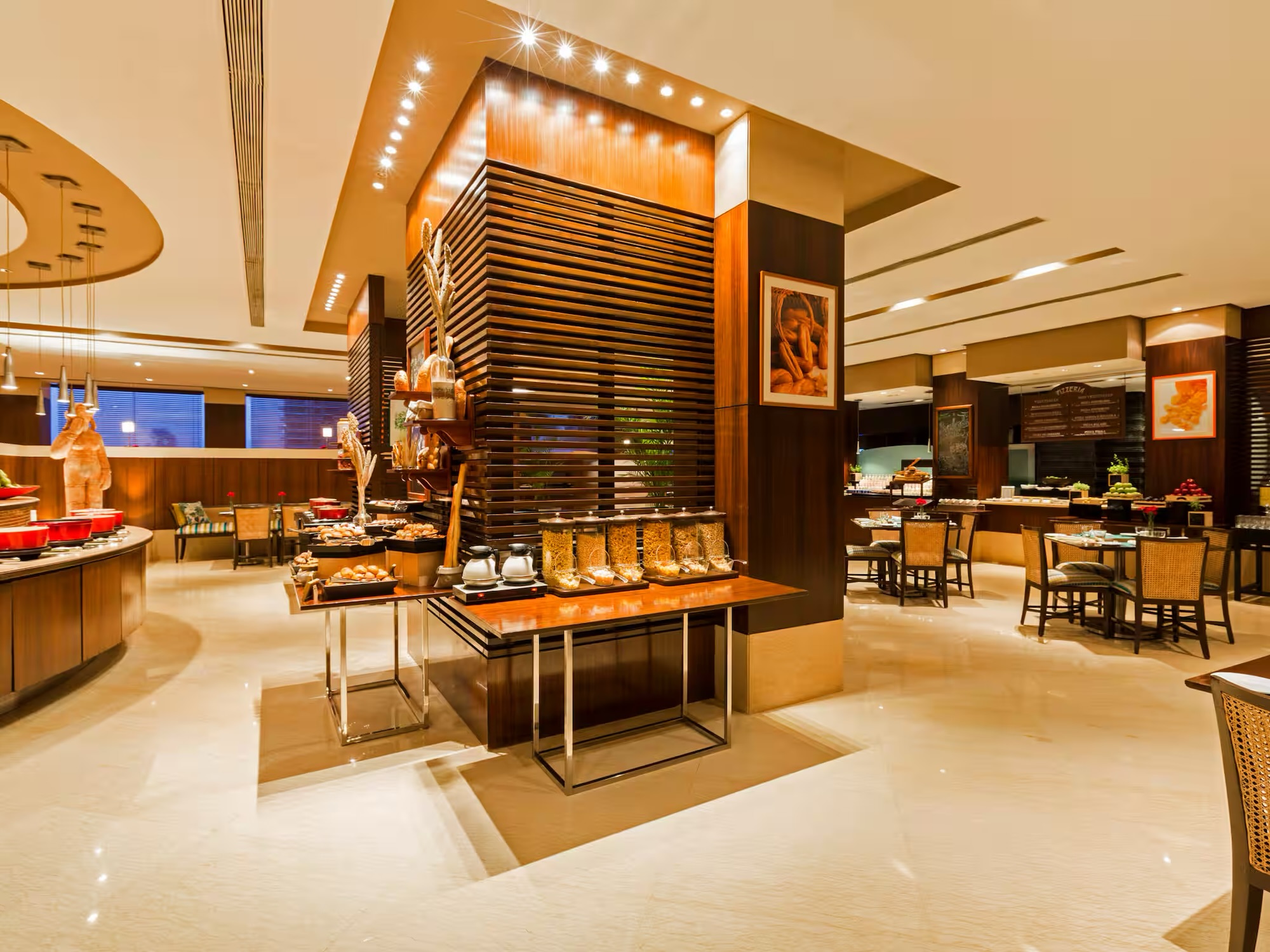 Vista is a premium buffet choice that pairs an expansive spread with views of the Arabian Sea. The offerings are allow you to move across cuisines, from Indian and Asian selections to continental favourites, with live counters and a strong dessert section. The space is tranquil yet cosmopolitan, making it suitable for a fancy meal. Wood-fired pizzas, freshly prepared kebabs, and even late-night coffee add range beyond the standard buffet format.
