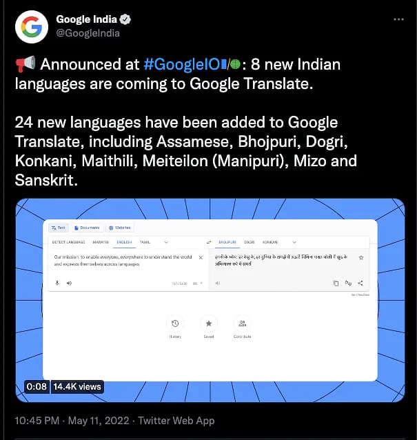 हाल ही में जोड़ी गई 24 भाषाओं में से 8 भारतीय भाषाएँ हैं, असमिया, भोजपुरी, डोगरी, कोंकणी, मैथिली, मेइतिलोन, मिज़ो और संस्कृत। नवीनतम अपग्रेड के साथ, Google Translate में जुड़ीं 8 और भारतीय भाषाएँ अनुवाद आसान बनाएंगी।।