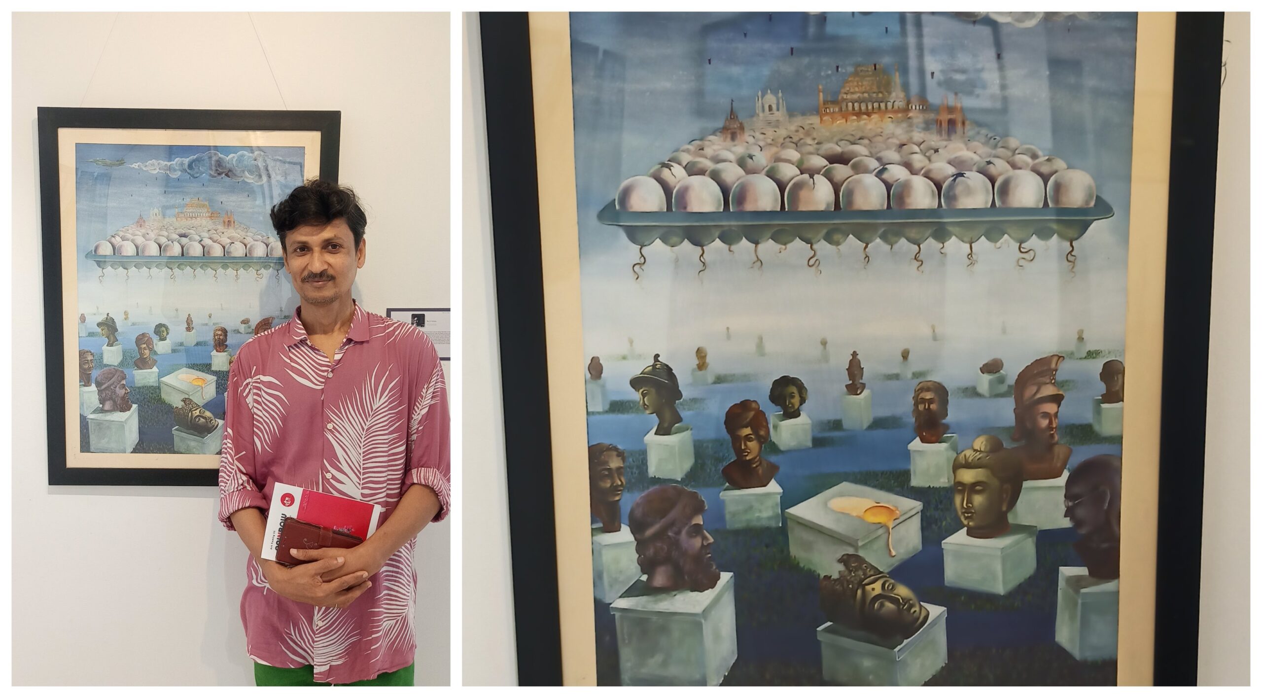 The enchanting art exhibition also showcases captivating paintings by Subhendu Biswas, another skilled artist from the group, originating from Kolkata. His remarkable artwork harmoniously integrates mythological and spiritual elements, expertly presented on expansive portrait canvases.