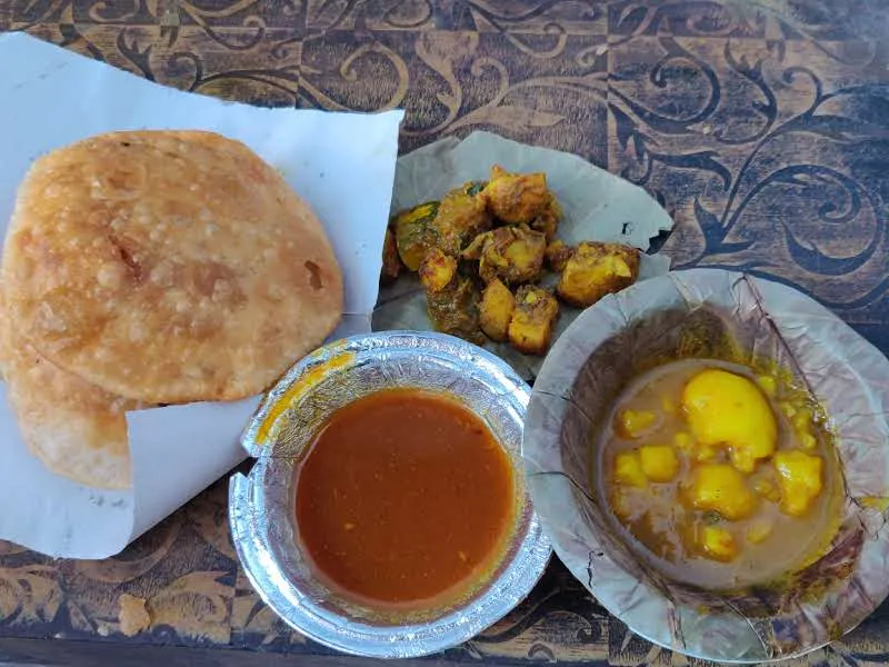 Sevak doesn’t do ordinary, and their khasta is proof. While everyone else keeps it simple, Sevak shows up with three vegetables: Aloo Ki Gravy Sabzi, Aloo Ki Sukhi Sabzi, and Kaddu Ki Sabzi, all on one plate. Then the Galka chutney lands, sweet, sour, and absolutely perfect. It’s chaotic in the best possible way, and every single bite feels like a pleasant surprise.