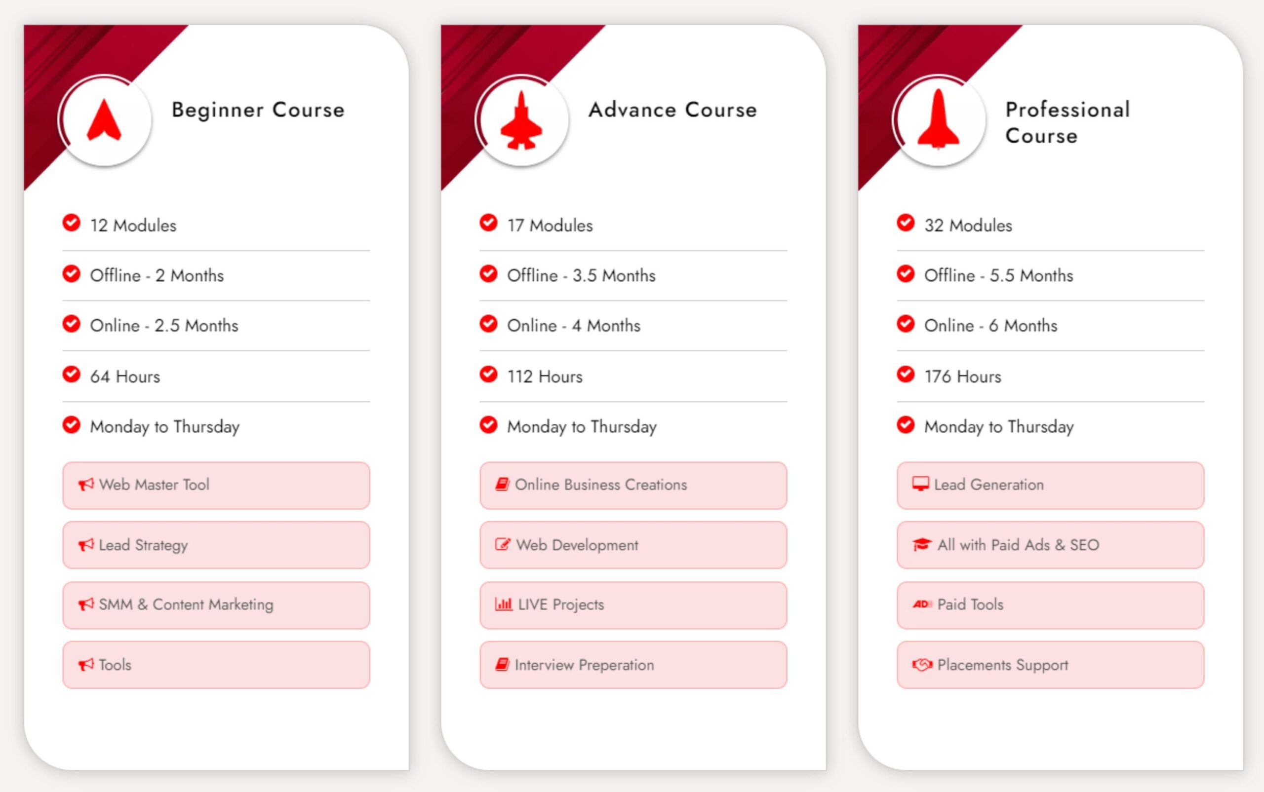 Beginner, Advance and Professional level certification courses with placement support